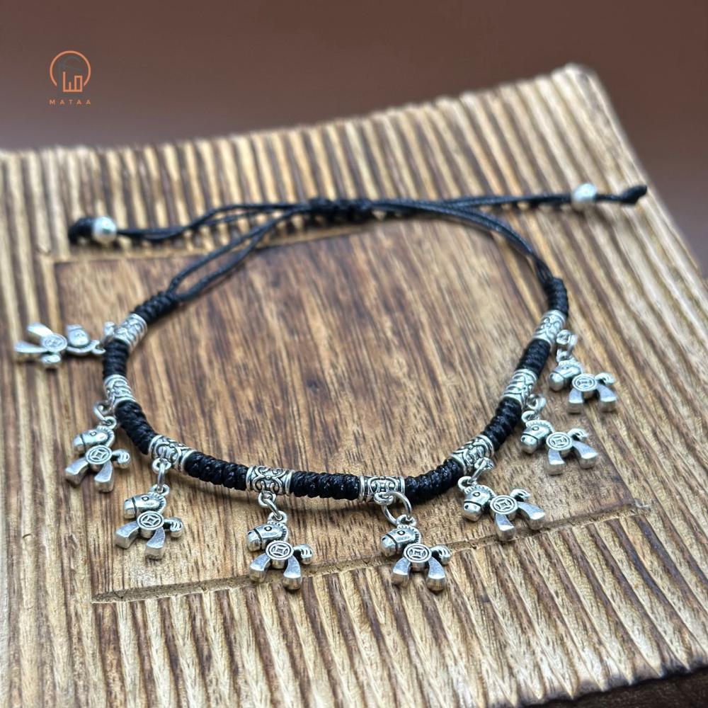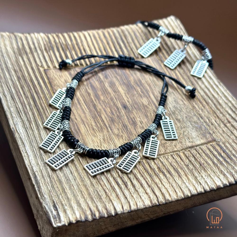 خلخال يتميز بتصميم أنيق مصنوع من خيط أسود مجدول بإحكام مع لمسات فضية. يحتوي على مجموعة من التعليقات الصغيرة بأشكال مختلفة. يتميز بتصميم قابل للتعديل ليلائم مختلف مقاسات القدم. يبدو أن هذا الخلخال مستوحى من الطراز التراثي مع لمسة عصرية، وهو مناسب للإطلالات الكاجوال والأنيقة.